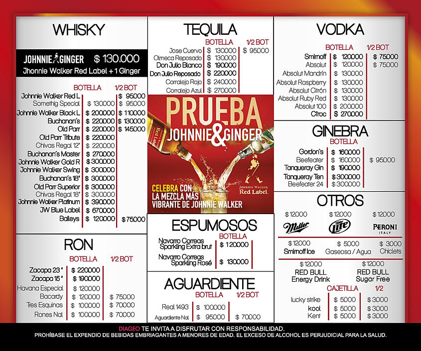 PRECIOS:LA CERVEZA CUESTA $5.000 Y LAS BOTELLAS DE LICORES VAN DESDE $85.000 HASTA $150.000. TAMBIEN HAY SHOTS ENTRE $9.000 Y $12.000
